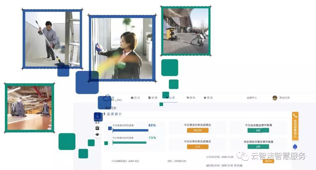 ■云智洁通过前期踏勘将每日清洁任务录入系统,物业方坐在办公室通过"品质模块"就可以随时查看项目中各功能区的清洁情况。