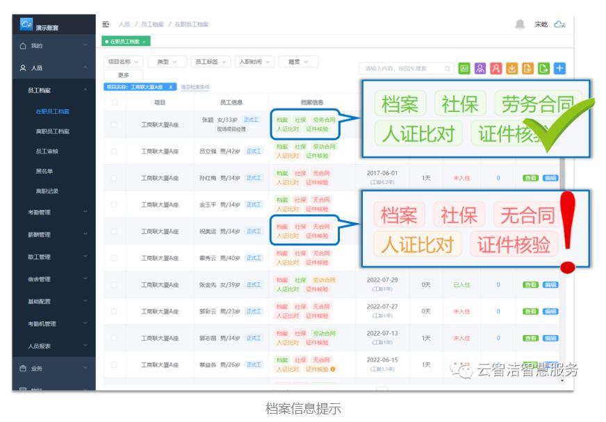 从档案信息中可以看到,有【档案】、【社保】、【合同】、【人证比对】、【证件核验】几个标签,并且标签分为“绿”、“黄”、“红”三种颜色显示,分别对应“正常”、“提示”、“异常”三种状态。