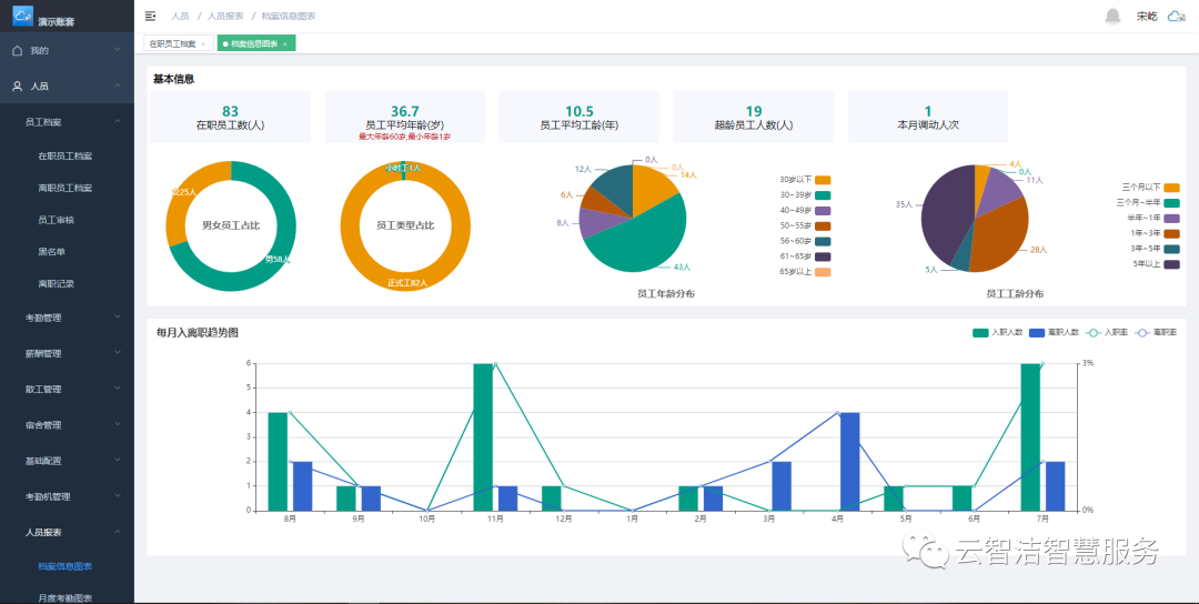 报表功能将人员信息进行分类汇总,以图表形式展示出您需要的人员信息(如:人数、平均年龄、离职率等等),这些一目了然的信息为您提供管理决策的数据依据。